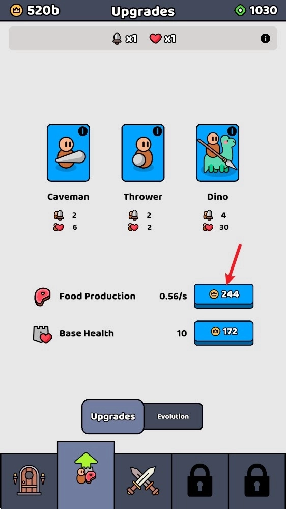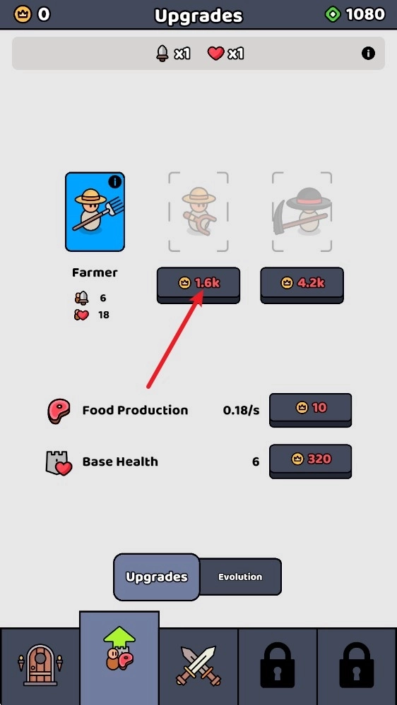 1、点击下方第二个按钮进入后,就能看到自己已解锁的士兵,点击“升级”按钮可提升基地血量与食物生产速度。