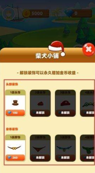4、进入柴犬小铺,使用钻石解锁头部和身体装饰,这些装饰可永久提升金币收益,让养成过程更具趣味性。