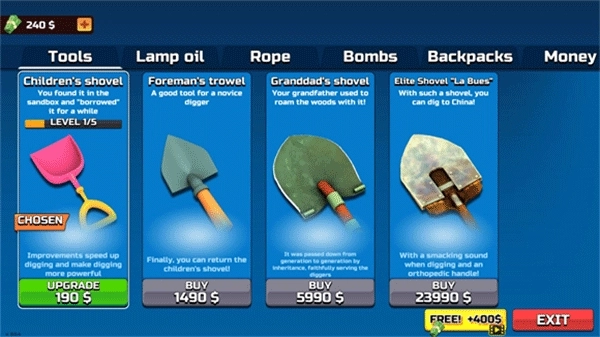 6、你可以用赚取的金币购买更强大的挖掘工具,或者升级已有的装备,以此提升挖掘效率。