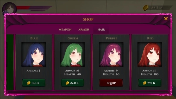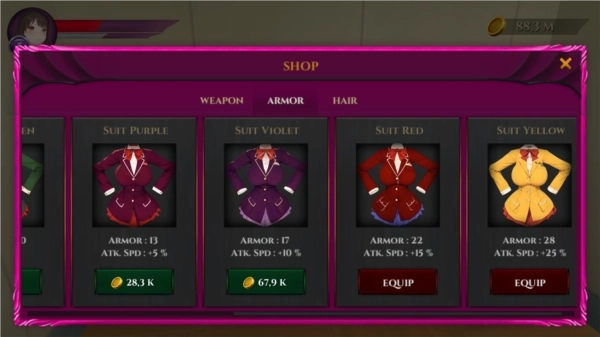 3、游戏提供多种服装定制选项,允许您根据自己的喜好为角色选择不同的服装,使她看起来更加个性化。每种类型的服装都会带来不同的属性奖励,例如提高战斗力或增强社会魅力!
