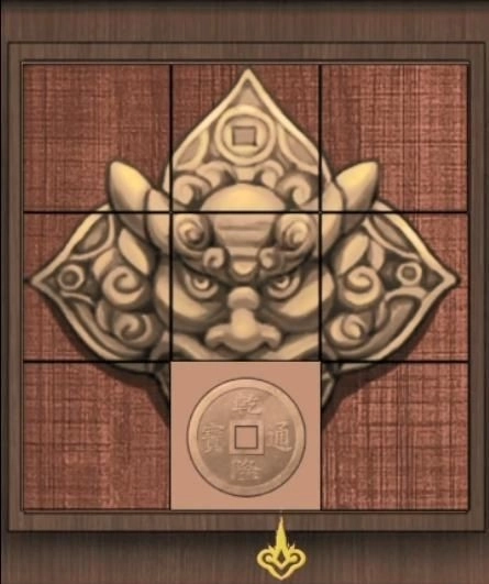把拼图放上去调整成下图所示的样子,就能得到【铜钱】;将铜钱装到门上左边的孔里,可获得【游戏币】;接着在左边房间的盒子上安装把手,投入游戏币后就能拿到【傻开心娃娃】。