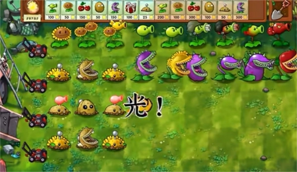 4、进入游戏后的界面如图所示,玩家能够在同一个格子里种植两棵植物,通过这种方式合成一株融合形态的植物。举例来说,把向日葵和豌豆射手进行融合,就能得到向日葵豌豆射手。