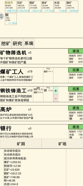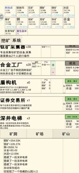 1、《重生挖矿》的核心玩法聚焦于资源的获取与管理。玩家点击屏幕上的“挖矿”按钮,即可模拟开采操作来获取基础矿石资源。这些资源是游戏发展的初始根基,为后续的科技研发和设施建造提供了不可或缺的材料支撑。