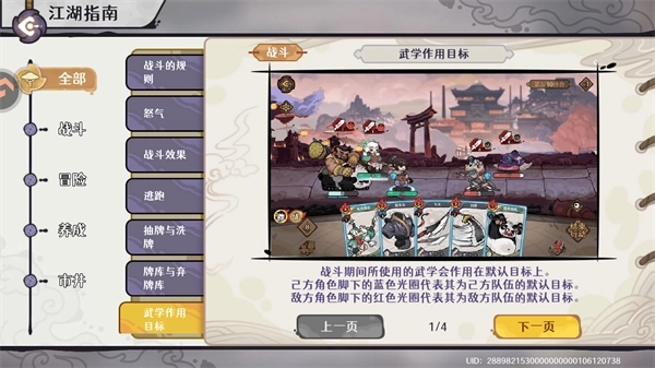战斗过程中使用的武学会施加在默认目标身上。己方角色脚下的蓝色光圈表示该角色是己方队伍的默认目标,敌方角色脚下的红色光圈则表示该角色是敌方队伍的默认目标。