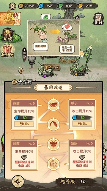 6、随着通关次数增加,将逐步解锁更高的种群等级与螳螂阶级,玩家还可通过升级与基因改造,不断打造属于自己的最强螳螂军团。