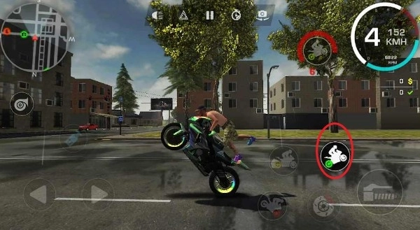 屏幕右侧第二个动作是摩托车抬头,把这个动作和驾驶键一起按,就能做出抬头前进的特技。