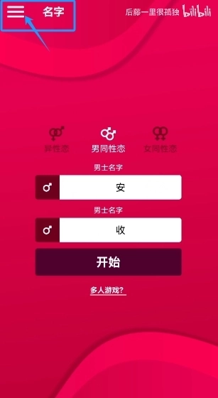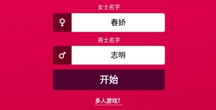 1、首先,我们要进入游戏,选择一种恋爱类型,接着输入双方的名字,确认无误后点击开始。
