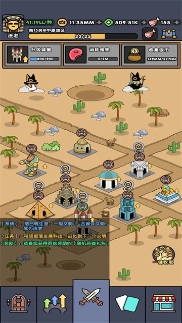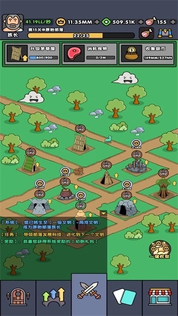 这是一款融合放置、肝度玩法与文明进化元素的游戏,主角携系统转生到【一级文明】——两河文明,成为原始部落的族长,需通过完成通关任务,推动文明向下一阶段进化。