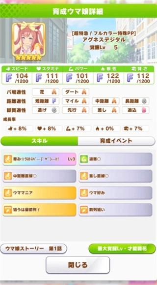 从图中我们可以看到五项属性所分别引导的关于马娘组成的数值。并且明显的可以看出根据赛距长短,需要的属性有所不同如何提升数值呢?除了最普遍的技能卡提升,训练提升外,还有基因继承,自身开花以及觉醒等游戏中种种提升数值的手段训练提升除了主属性提升外,也会提升部分副属性以及增加技能点