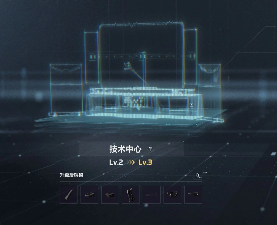 技术中心具备武器配件的制造与生产能力,随着升级进程的推进,能够解锁更多种类、更高等级的配件图纸。