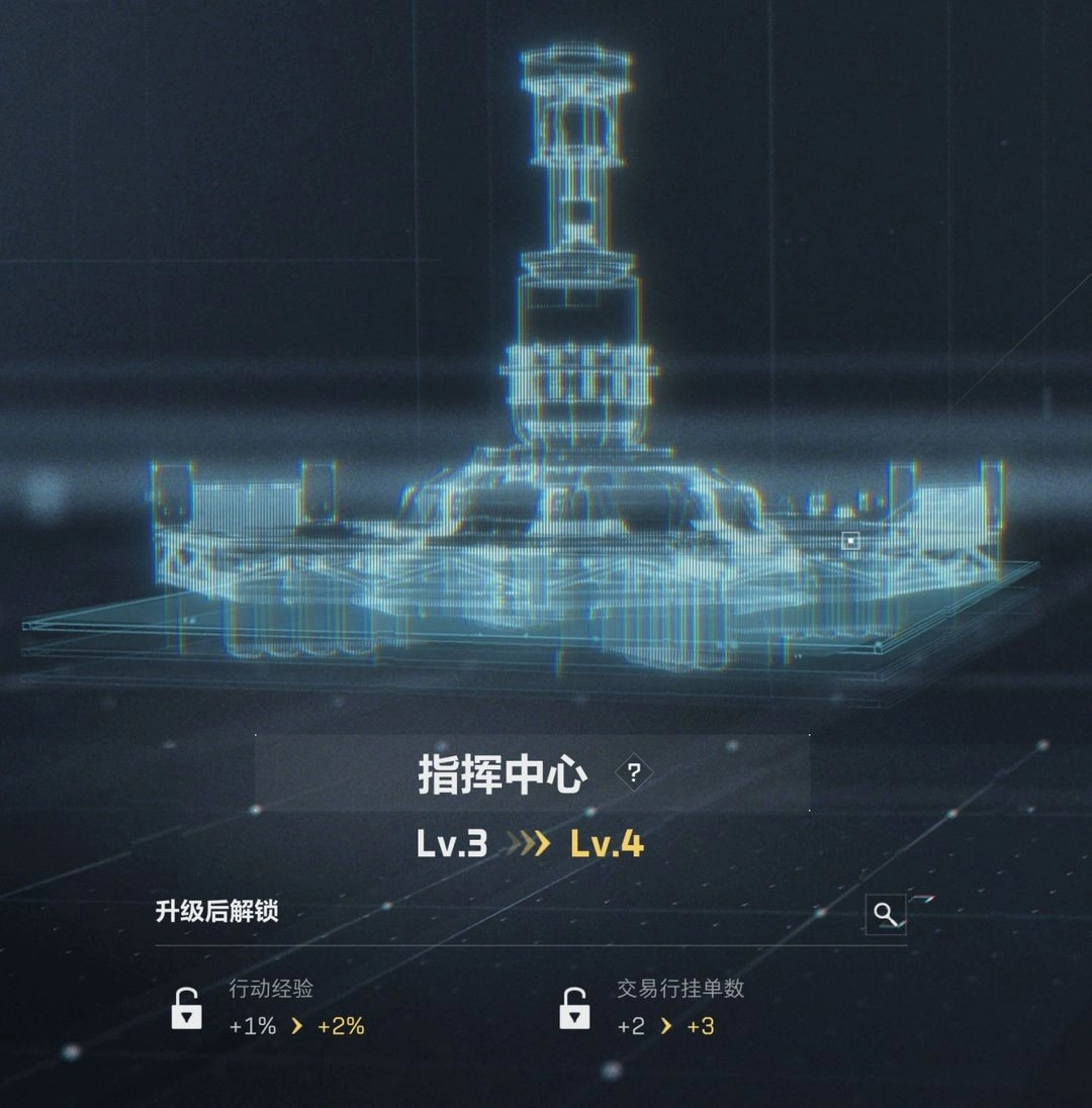 升级指挥中心能够提高行动经验的加成比例,同时增加交易行的上架物品数量,这样干员就能获得更多的交易机会。