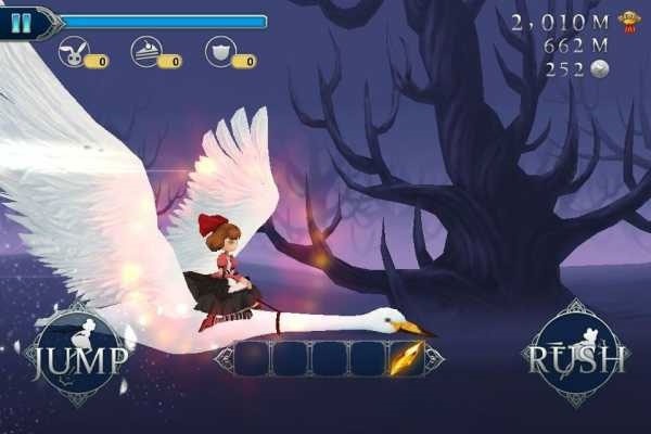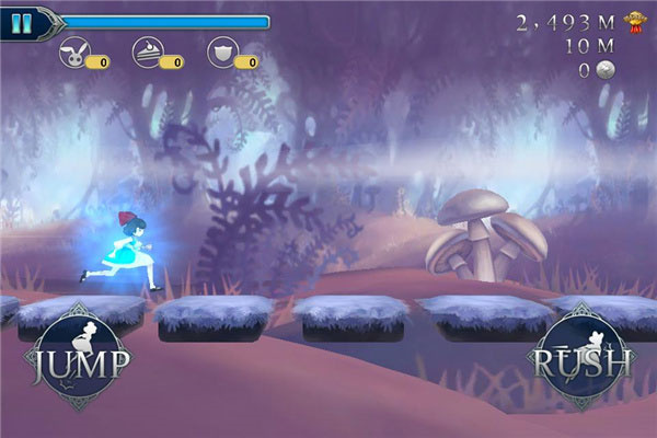 这款游戏操作简便,玩家仅需点击屏幕,就能完成所有必要动作。屏幕左边设有虚拟按键“JUMP”,按下此键爱丽丝即可跳跃,若持续按住,爱丽丝便会飞行;屏幕右边的“RUSH”按键为冲刺功能,不仅能加快前进速度,还可撞开阻挡的障碍物。