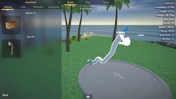 在建造模式下,你能够通过调整生物的脊椎来定制它的外形,还能添加可变换的身体部位。对生物进行修改会改变它的各项属性(比如体重、移动速度、生命值等),而装配特定的身体部位则会让它获得特殊能力(像飞行、游泳、撕咬等)。