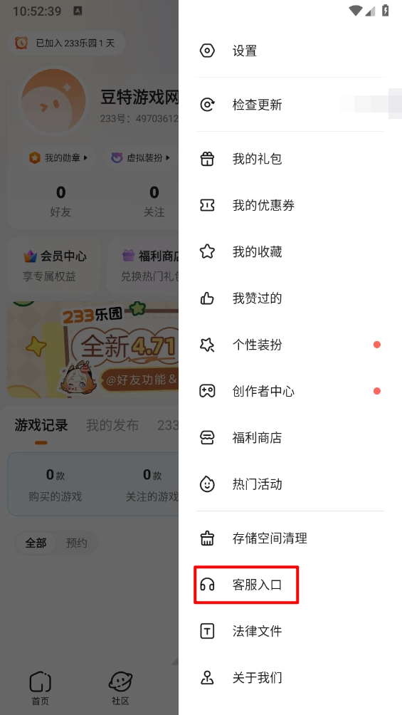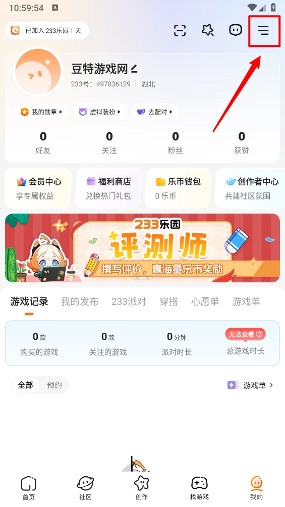 打开233乐园,进入主页点击右上角"我的游戏"。