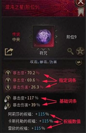 混沌之星(球),球的阶位在3到9之间(不含5阶)。其中3阶球较为特殊,它只能通过主线任务获取,仅能提供祝福数值,自身没有任何词条;4阶及以上的球才会拥有词条。4阶和6阶球都带有2个基础词条,前缀和后缀各一条。7阶、8阶、9阶球则是在2个基础词条的基础上,分别额外增加1条、2条、3条指定词条。