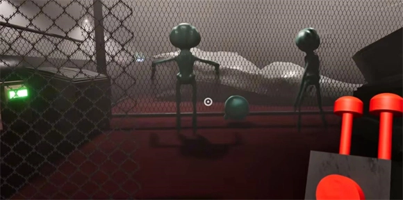 在城镇里有两个外星人,只要打开旁边的机器,他们就会开始跳舞。