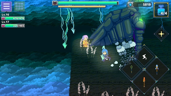 召唤伙伴后进入探索区域,碰到怪物时可使用右下角的剑或弓发起攻击。