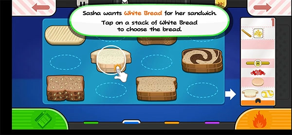 挑选好所需的食物后,点击面包片,食物就会自动放置在面包上,最后只需点击右下方,就能完成三明治的制作。