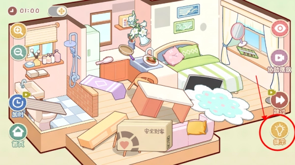 3、辅助功能:点击右侧的协助摆放按钮,能快速把部分物品移到正确位置。