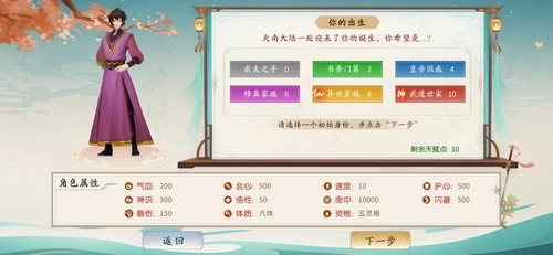 玩家需要为自己选择各类天赋属性的加成,不过可供自由分配的天赋值只有30点。