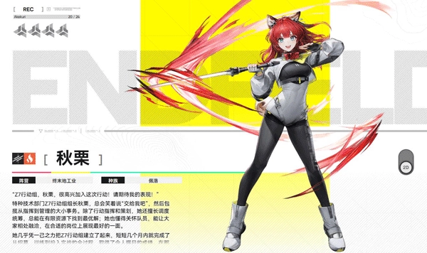 这位女性神秘而冷淡,不仅学识渊博,还具备出色的信息技术天赋,经院长引荐加入终末地工业。她的定位为远程输出,精通科研类道具的运用与数据支持,能够在远距离对目标造成致命伤害。