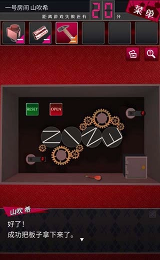 走到板前,把齿轮和纱布装上去,转动两侧的力臂,调整字母使其显示为“NINE”,接着点击“OPEN”按钮,就能拿到钥匙。