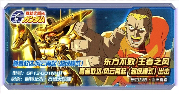 「典藏」机体尊者敢达/风云再起(超级模式)素以压倒性的机动性与先锋突袭能力闻名,其自带的“无畏先锋”技能增益可大幅提升全队格斗系机体的暴击率与连击数。这款机体既能在纯格斗体系中发挥联动效应,也能在多模式混编队伍里充当核心输出与节奏带动的角色。此外,它与神敢达/明镜止水之间存在隐性技能共鸣机制,当两台典藏机体同场作战时,将触发额外的状态叠加效果。
