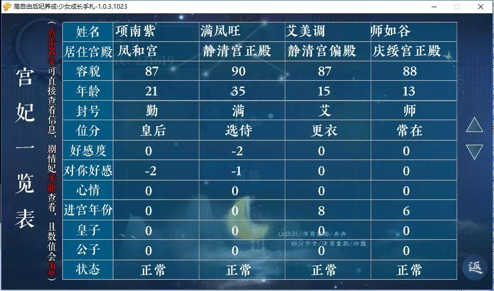 【真实模拟后宫】:为了增强后宫体验,目前用到九千+数值(非最终数量,一直在增加)决定其他妃子,最大可能拟人化,使其不再是冰冷*板的数值,每个妃子都有自己的性格,属性,目标,心愿,喜好,经历过往,喜欢的闺蜜,讨厌的仇敌,甚至精细到每个妃子和妃子之间都有详细的好感关系数值,只为带给你一份最真实的宫廷历程。