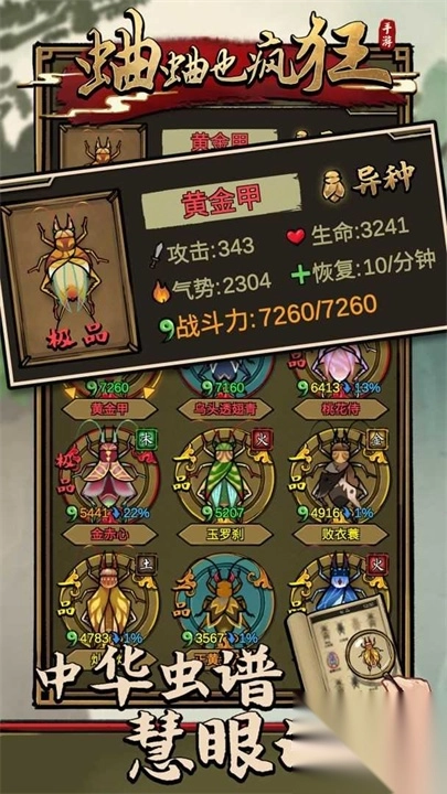 1、一款玩法特别的昆虫格斗游戏,游戏的画面风格比较吸引人,斗蛐蛐的玩法也挺欢乐。