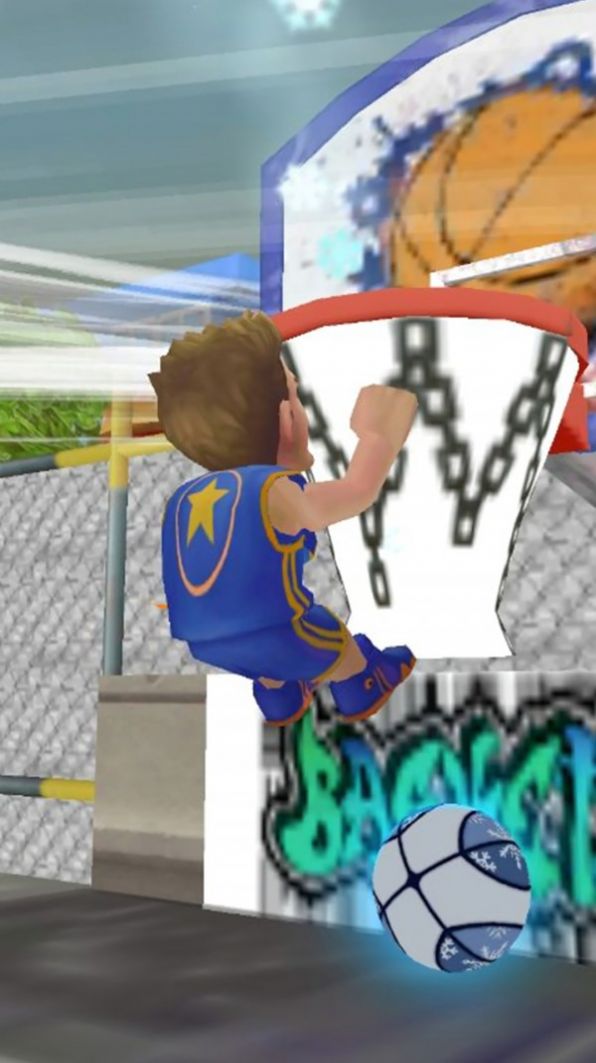 2、在这个卡通风格的场景画面中,你可以进行自由的投篮冒险来投中球框。
