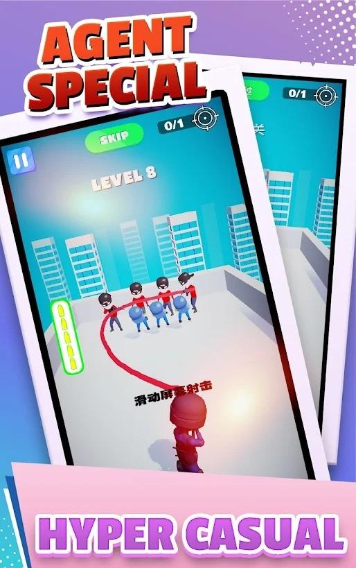 2、随意滑动屏幕,绘制子弹的飞行轨迹,躲避人质,消灭歹;