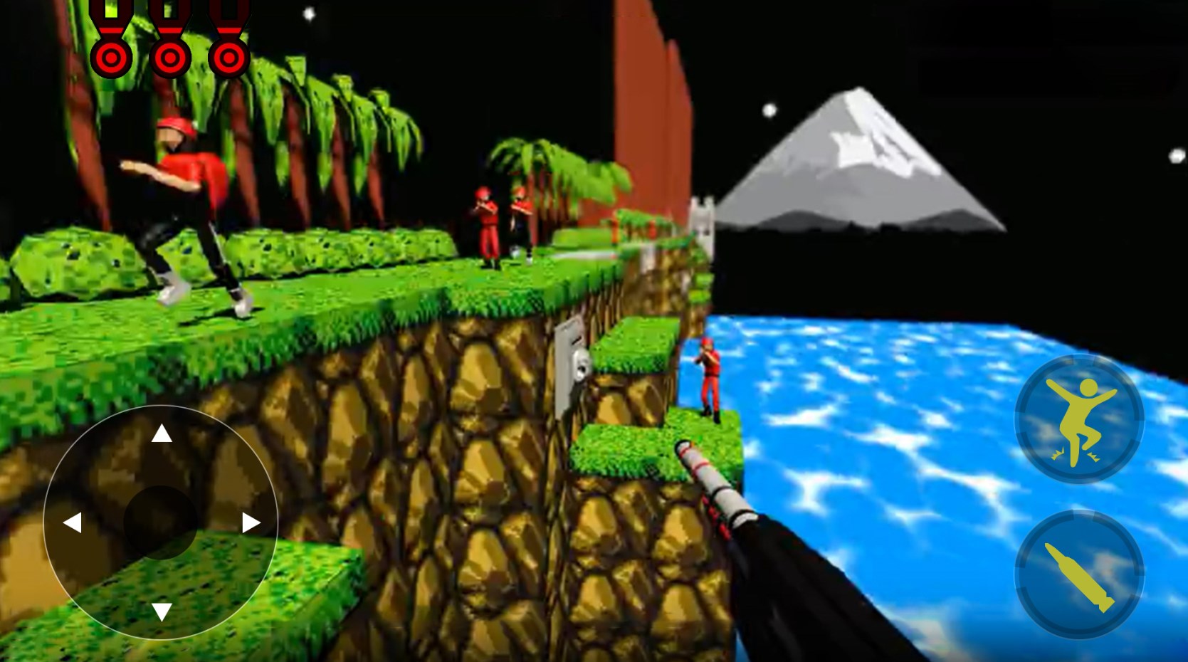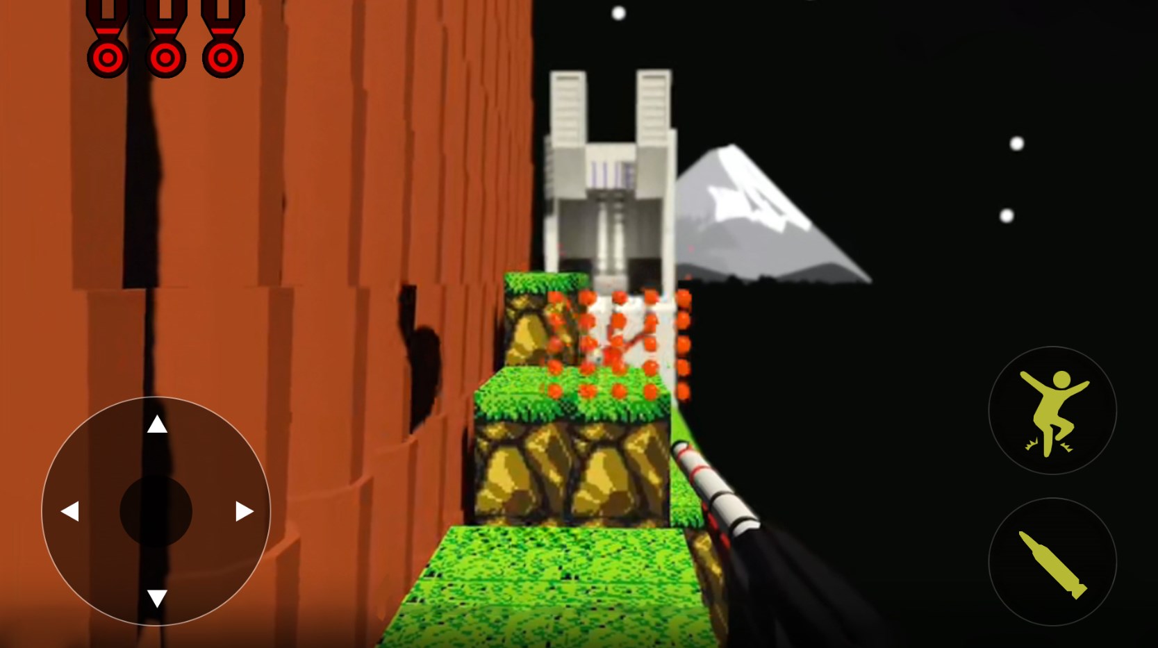 3、我们只能够通过跳跃的方式来躲避敌人的子弹,每次中弹都会扣一条生命,每次闯关我们只有三条命!