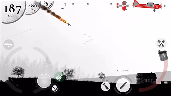 起飞后可以观察飞机的状态,包括左上角的时速、高度、油量,中间的关卡地图标识。