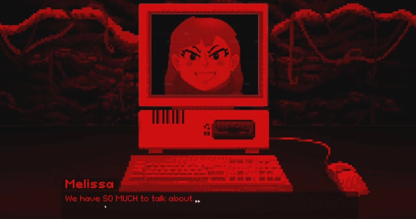 Melissa是一款惊悚烧脑的解谜游戏,高饱和红色和绿色的画面,画风复古黑暗。通过游戏界面中的电脑和你的网恋女友互动交流,开启你的冒险之旅吧。玩家需要仔细注意剧情中的细节。和女孩对话时选择合适的回复,出现任何异常情况都要第一时间解决。游戏非常烧脑,锻炼玩家们的逻辑思维能力,收集线索,寻找真相吧。