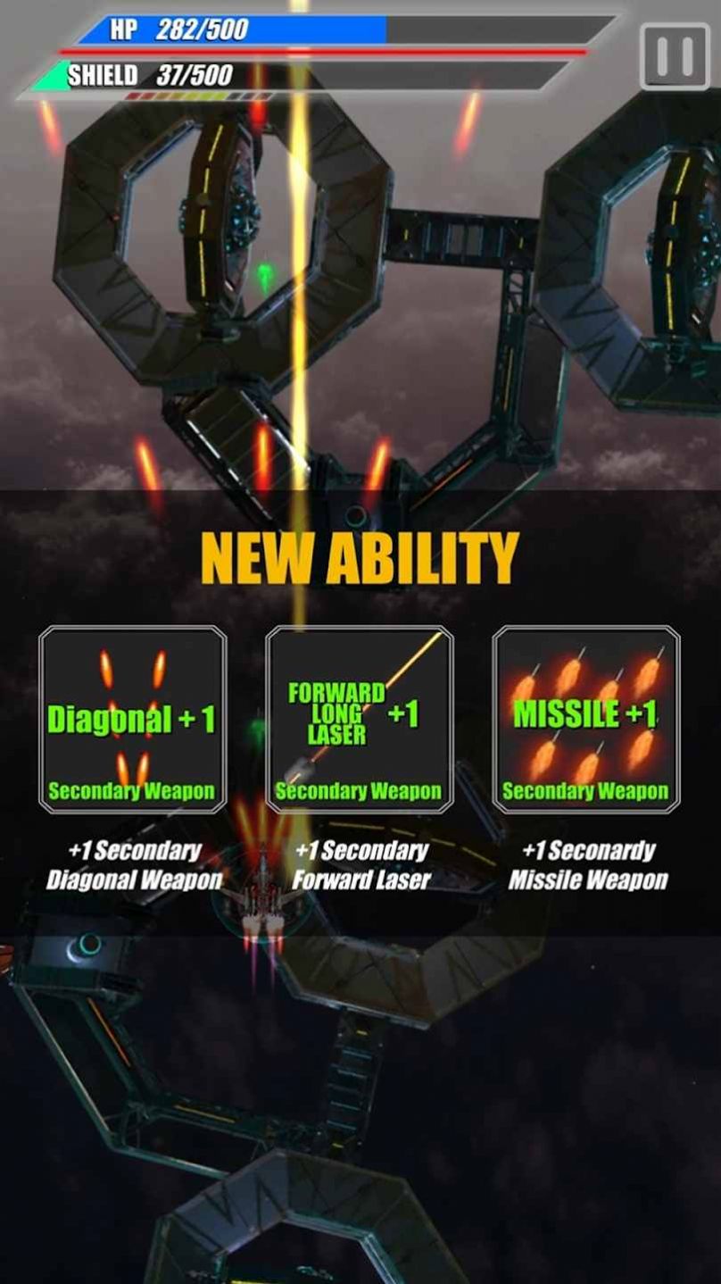 3、在每个波段结束时选择随机技能、为太空战机提升火力。