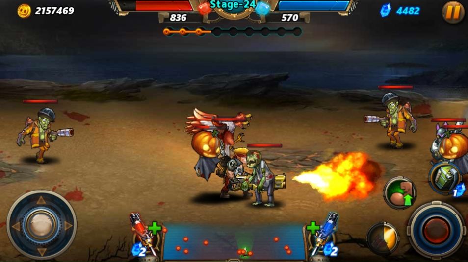 1、使用各种武器和技能,来消灭前方出现的僵尸和怪物,并躲避它们的攻击;