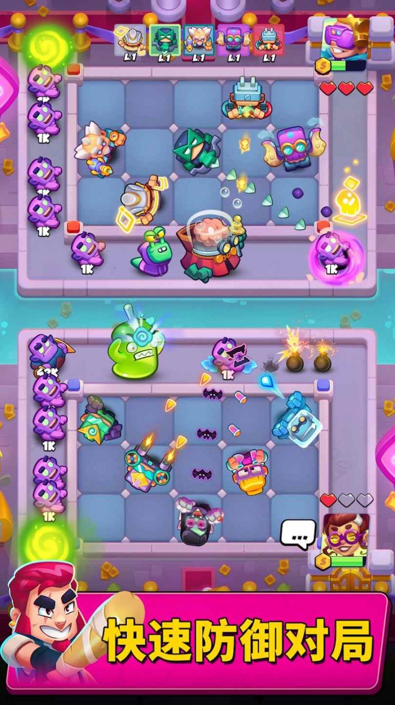 2、征服敌人,不断推进,最终拿下超多奖杯!在防御对局中挑战全球顶尖玩家,让他们看看谁才是第一;