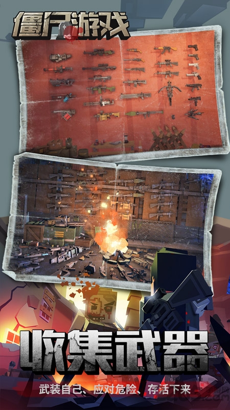 2、自由搭配你喜欢的武器套装,在大型MC像素风荒野小镇行动,营救幸存者,搜寻物资,清理游荡丧尸。