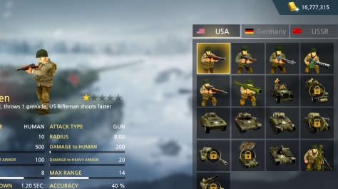 3、游戏包含许多经典的战争机器和二战士兵,但每回合只能选择一个国家单位进行战斗。