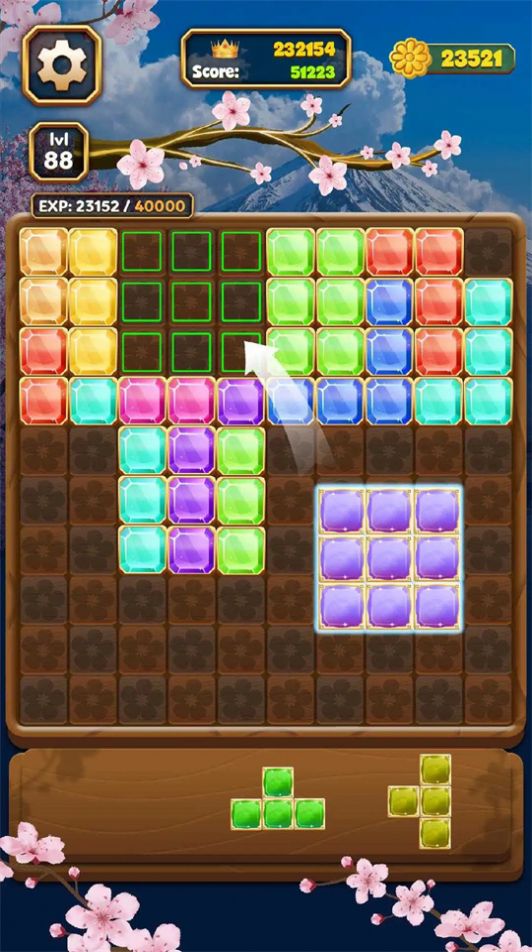 宝石积木拼图是一款益智类游戏,游戏中玩家需要将不同形状的积木拼接在一起,组成特定的图案或形状。每个积木由多个小颜色方块组成,玩家可以旋转、移动和翻转积木来完成拼图。拼出的图案可以是几何图形、动物或其他各种形象。游戏难度逐渐增加,需要玩家通过思考和实践来完成挑战。