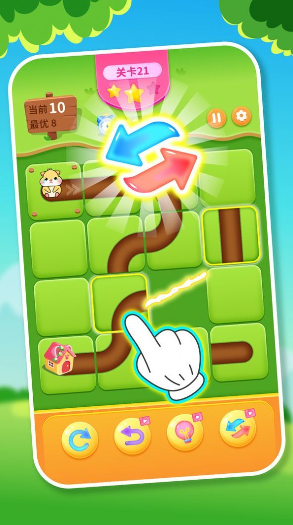 2、背景设置在小镇,在满足清单需求后将小仓鼠送回它的小窝。同时,将连通水管的段数作为游戏难度等级。