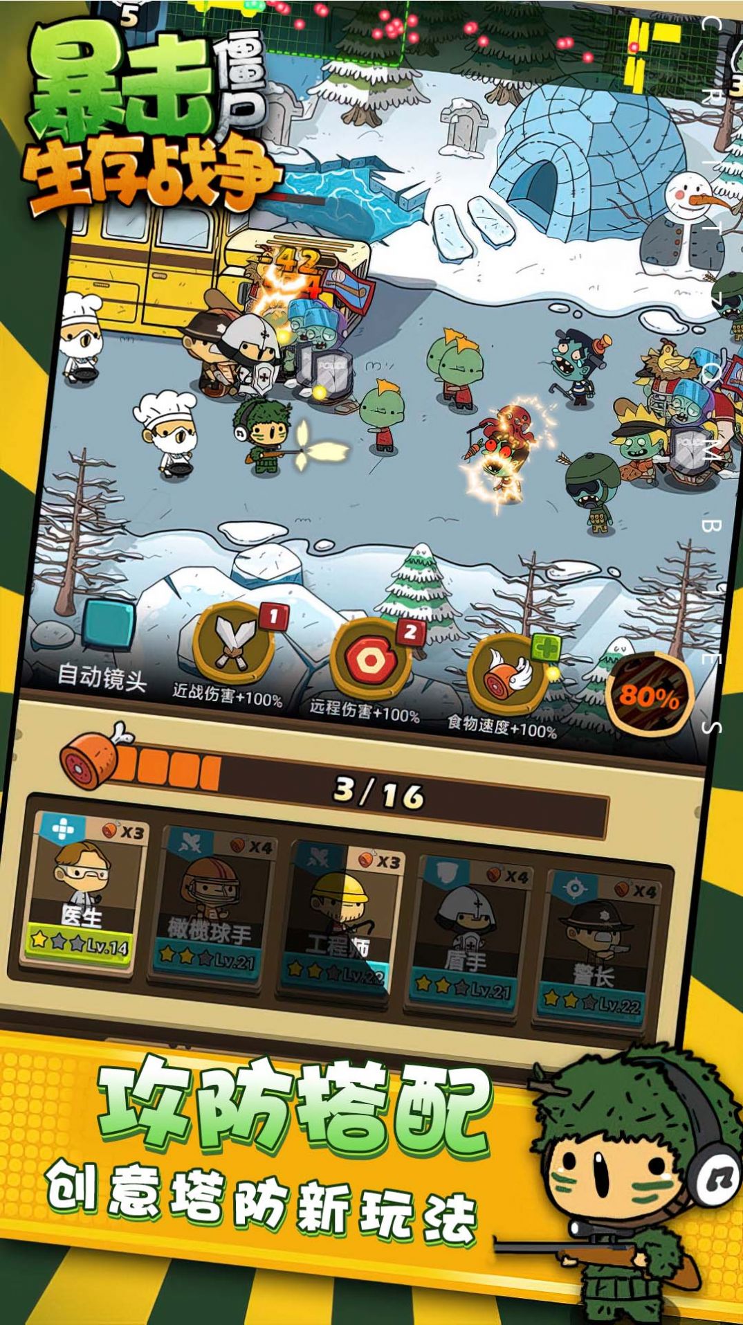 暴击僵尸生存战争这款游戏主要是策略塔防的类型,玩家在游戏中需要不断的去探索,去找寻资源、食物、武器、装备等等,只要将这些收集足够,才能更好的建设自己的基地,就可以去召集大量的幸存者,去抵御入侵的僵尸,不断的进行战斗就可以提升自身作战的能力,完成任务之后还可以获得奖励。