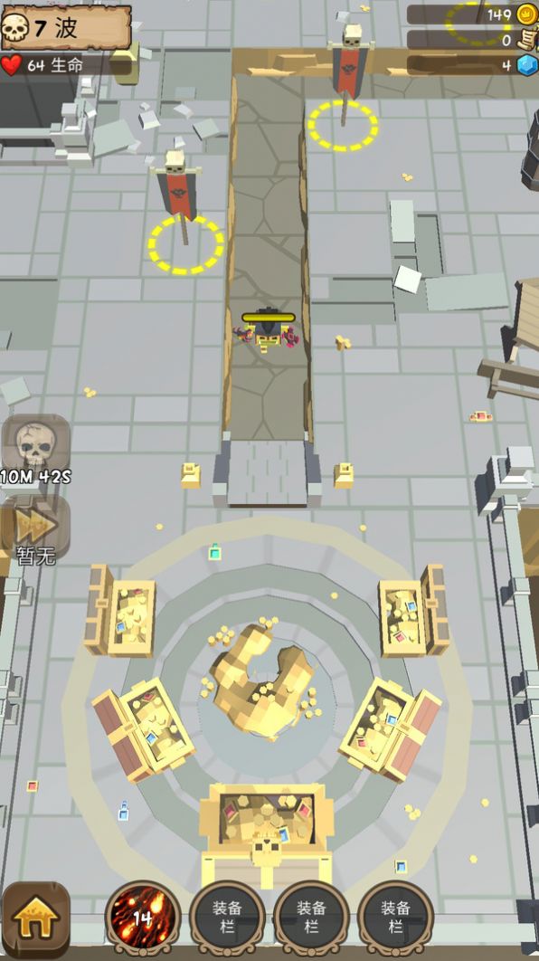 2、游戏中解锁大量的小英雄布置在各个防线当中,赚取丰收金币升级各个塔防道具。