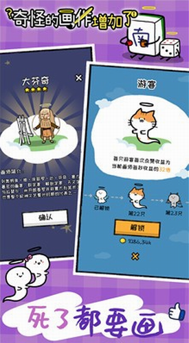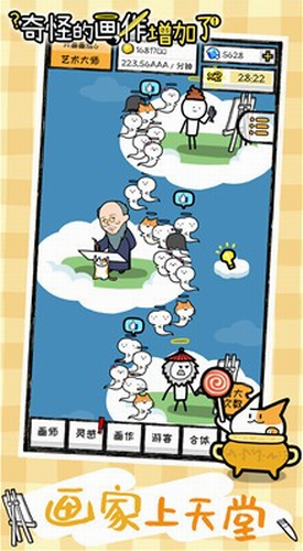 3、奇怪的画作增加了无敌版介绍一款佛系挂机游戏,世界各种名画家去世后在天堂又被重新召唤回来继续画画,也是比较惨了,名符其实的灵魂画师,死后都不放过他们,继续榨画们的脑洞。