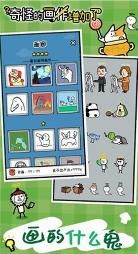 奇怪的画作增加了无敌版是一款十分有趣好玩的休闲益智的游戏,开启自己的画馆挣钱解锁高等级画师,简单的放置挂机玩法,搞笑的画面内容,在游戏中可以根据提示去完成画作,几十名画师一起召唤,让更多的小鬼游客为你点赞,玩家想要看不一样的画作可以点击加速灵感就能让画师们为你创造更多不一样的画作。会有什么样的灵魂画作等着你呢?快来试试吧!