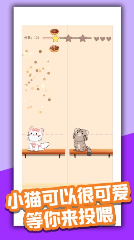 左右手通过移动猫咪,吃掉掉落的道具,反应力不及时的话,没吃到道具,游戏失败。