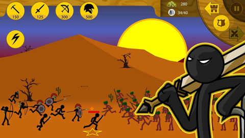 如果点击中间的盾牌按钮,火柴人士兵就会挡在基地前方,就算敌人过来了,也不会退缩一步,而是勇敢的上去与敌人厮杀。