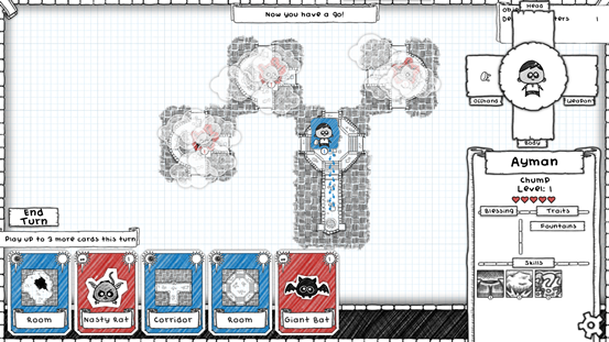 每使用3张卡牌后会开始这个回合的行动,如果没有想放的卡牌,直接点击“end turn”就可以开始回合。