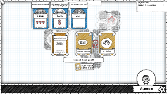 击败怪物后会有掉落装备供玩家选择,装备部件分为头,主手,副手,衣服4种,每个部位只能带一个