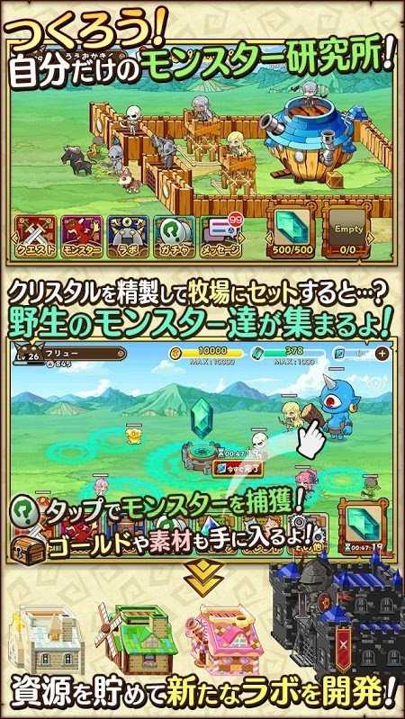 玩家化身为怪兽研究所的博士,养成研究室,收集怪兽,攻略敌人的堡垒等等,战斗所打下的金钱能够强化研究所的,育成怪兽。